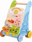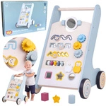Drewniany chodzik wspiera naukę chodzenia i rozwój małych rączek. Ma sorter, przewlekankę i labirynt. Stabilny, cichy, bezpieczny – idealny na prezent!