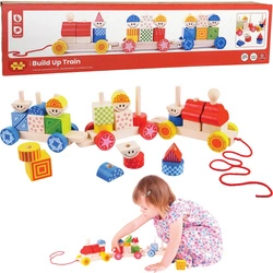 Kolorowy drewniany pociąg z klockami do ciągnięcia na sznurku. Rozwija kreatywność, zręczność i motorykę dziecka. Idealny prezent w estetycznym pudełku. 30 klocków, 55 cm długości.