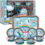 Zestaw do herbaty z motywem jednorożców (15 elem.) zawiera czajniczek, filiżanki, talerzyki i tacę. Wykonany z metalu, idealny do kreatywnej zabawy i odgrywania ról.