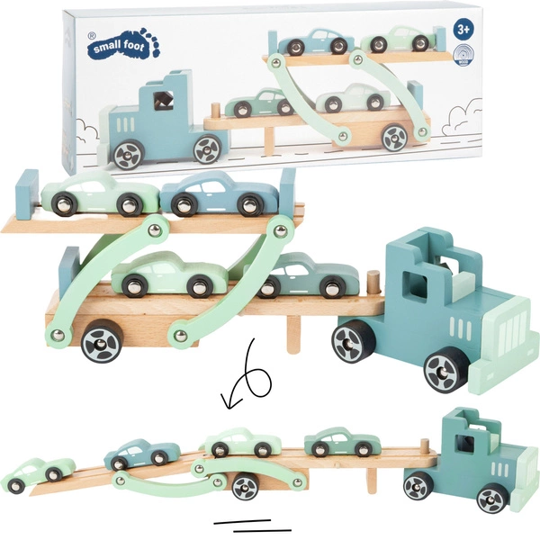 Uwaga ciężki ładunek! Do przewozu 4 modeli samochodów potrzebny jest duży transporter. Dzięki przechylanej powierzchni, drewniane samochody mogą wygodnie wjeżdżać na przyczepę. Przyczepa zabezpieczona jest barierką uniemożliwiającą cofanie się samochodów. Laweta musi teraz tylko być połączona z ciągnikiem siodłowym i już można ruszyć w daleką drogę.