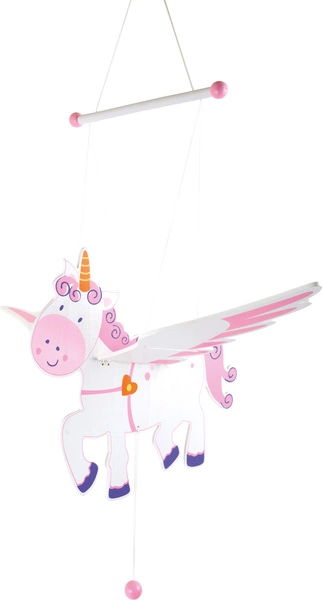 Jednorożec został wykonany z drewna. Jest biały z mocnym różowym akcentem kolorystycznym. Należy go zawiesić tak, aby dziecko pociągając za sznureczek z czerwoną kulką wprawiło w ruch jego imponujące skrzydła. Zabawa będzie radosna.