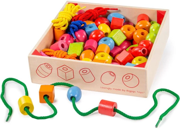 - Zestaw 90 drewnianych koralików i 6 sznureczków. Rozwija motorykę, kreatywność i wyobraźnię dziecka.