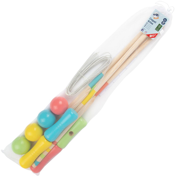 Ten 24-częściowy zestaw do gry w krokieta w wersji XXL zawiera: 4 drewniane skręcane młotki, 4 kule, 2 paliki i białe druty do utworzenia bramek. Oprócz metalowych bramek, wszystkie elementy zestawu zostały wykonane z certyfikowanego drewna i ładnie pomalowane. Wymiary: młotek - ok. 77 x 14 x 5 cm; kula: średnica ok. 7 cm.