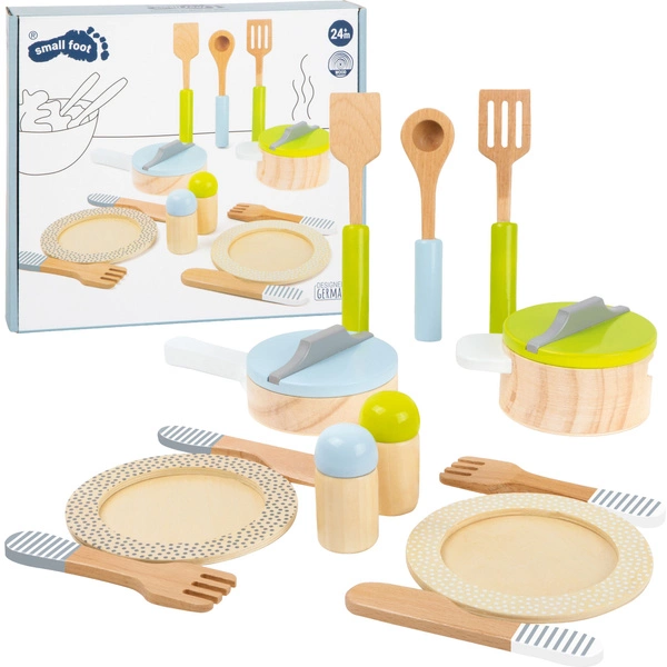 - Twój maluszek pokocha ten drewniany zestaw kuchenny! 15 elementów: garnki, patelnia, talerzyki, sztućce i przybory. Bezpieczne, kolorowe, idealne do zabawy w gotowanie!