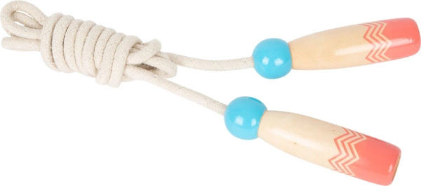 Rączki skakanki (o długości około 12 cm) zostały solidnie wykonane z drewna, ładnie ozdobione pomarańczowym wzorkiem i polakierowane. Sznurek skakanki jest naturalny, a jego całkowita długość to około 240 cm (sznurek przechodzi przez rączkę i na końcu ma supeł - można go więc w razie potrzeby skrócić).
