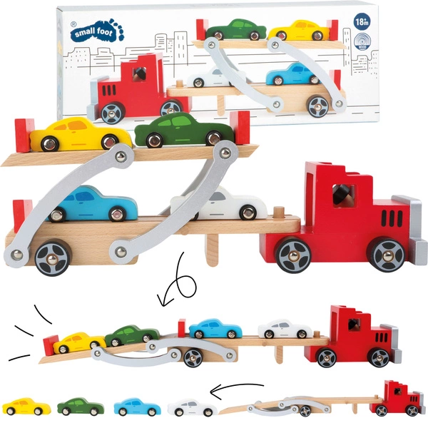 - Drewniany transporter przewozi 4 auta! Dzięki przechylanej rampie samochody wjeżdżają na przyczepę, zabezpieczoną barierką. Czas wyruszyć w drogę!